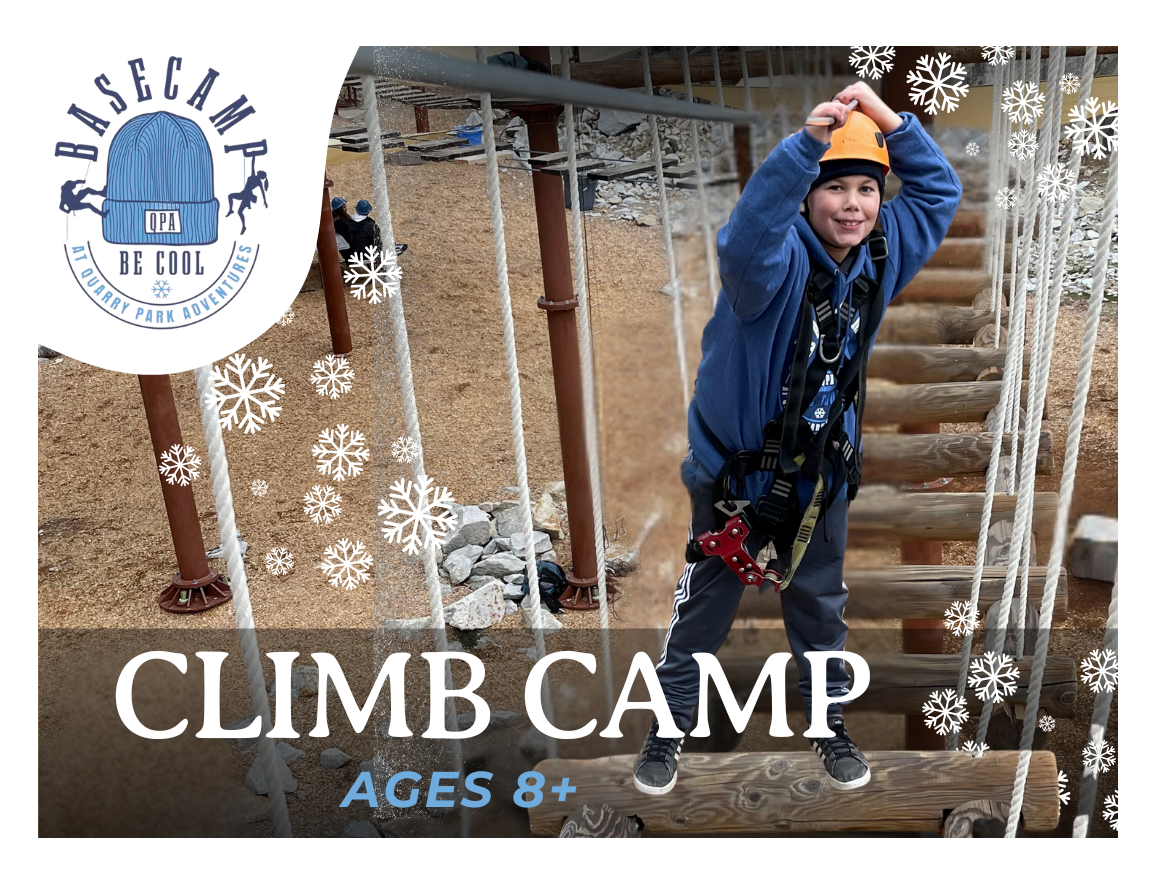Winter Climb Camp is most suitable for participants ages 8 years old and older, with a minimum weight requirement of 45 lbs. Camp programming includes: Quarry Adventures Access (All elements), Team Building Activities, and Games! Please see below for more information.